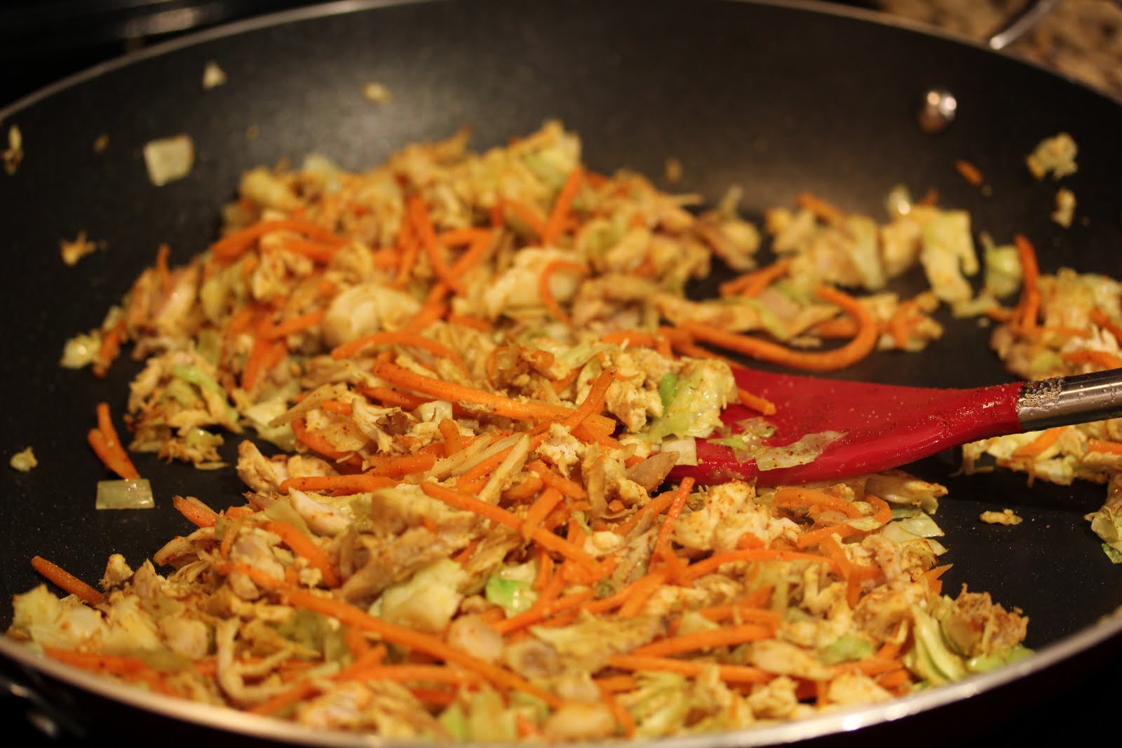 Add chicken, cabbage, carrots, salt, curry, and chili powder